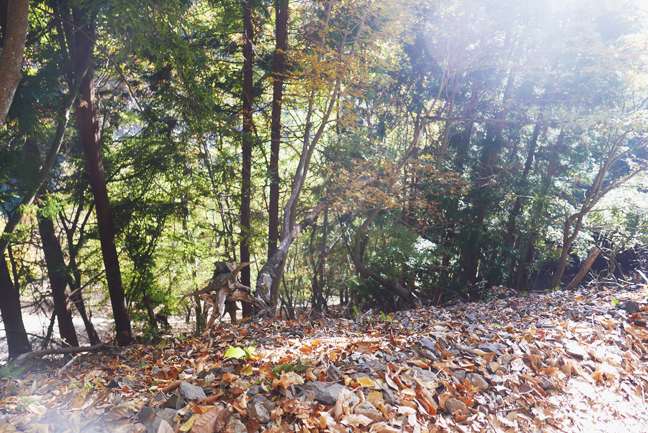 急斜面を登りきり正規登山道に出たところで、登った斜面を撮影。まさか登山口を間違えるとは自分でも思わなかった。無事登山道に戻れたのは、さきほど神社に手を合わせたからだろうか。太陽光だろうけど、写真もこの1枚だけやけに白飛びしていた(おわかりいただけただろうか)。