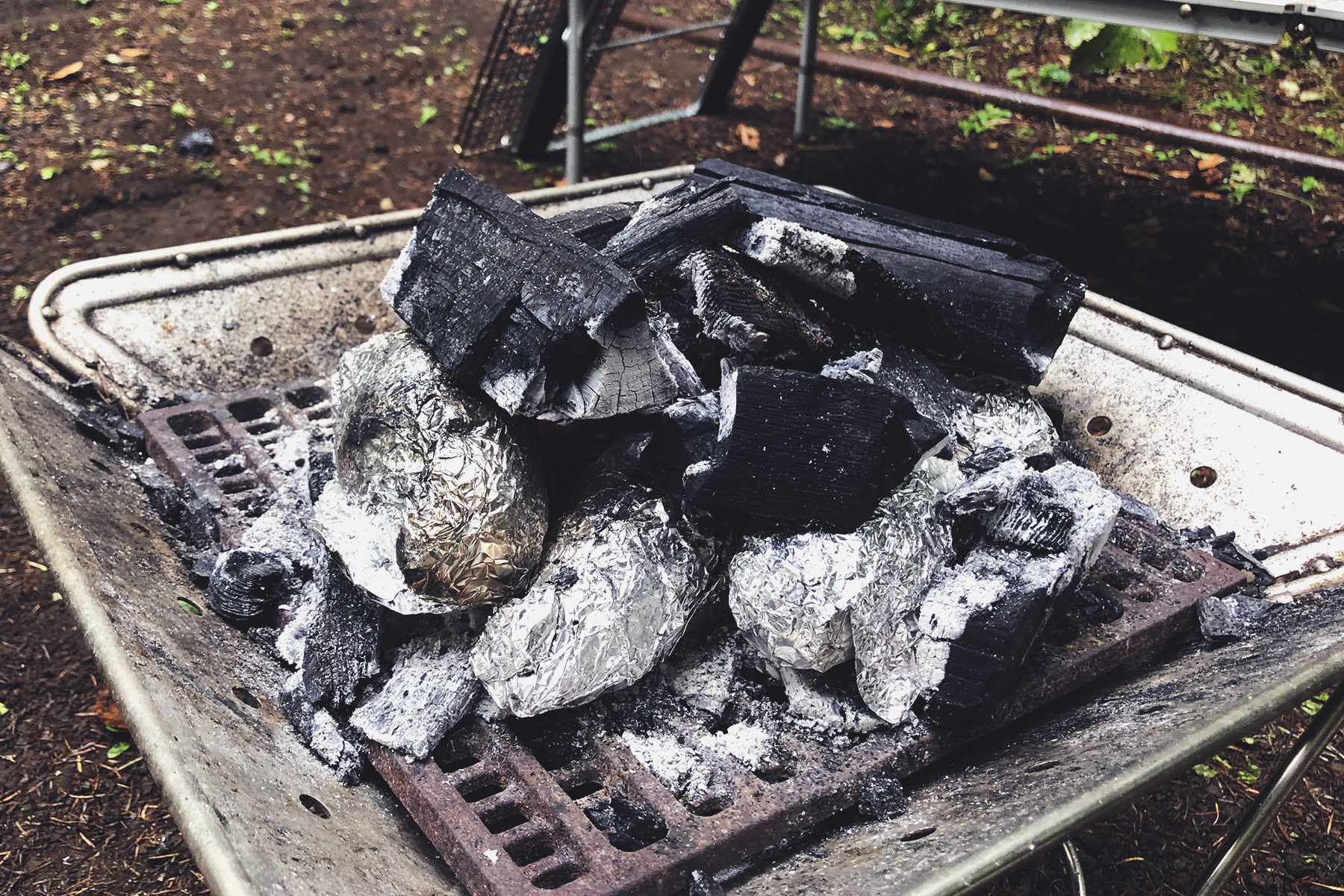 焼き芋は、濡らしたキッチンペーパー+ホイルに包んだ後に焚き火台の中にいれて約30分。いい焼き色だ!もう秋なのだ!