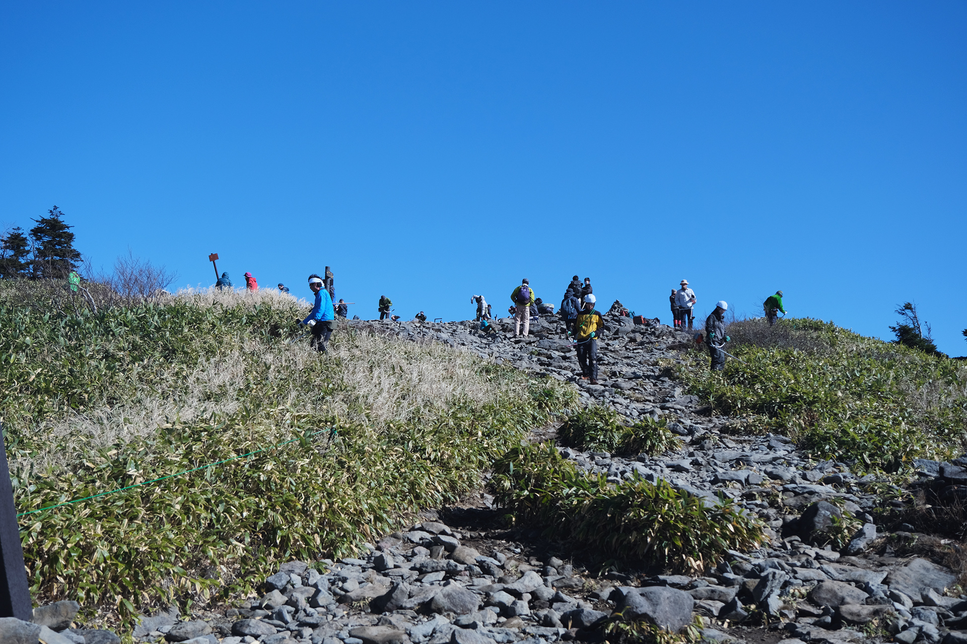 昼食休憩の後、根子岳まで戻ると地元ボランティアの方々30名ほどで山頂付近の草刈りが行われていた。カメラクルーの撮影も入っていた。あとで調べたら、根子岳・四阿山保全協議会主催「ササ刈りし、在来山野草を回復させるイベント」なるほど!昨日の湯ノ丸山エリアに負けず、こちらも地元に愛されている山であることがよくわかる。