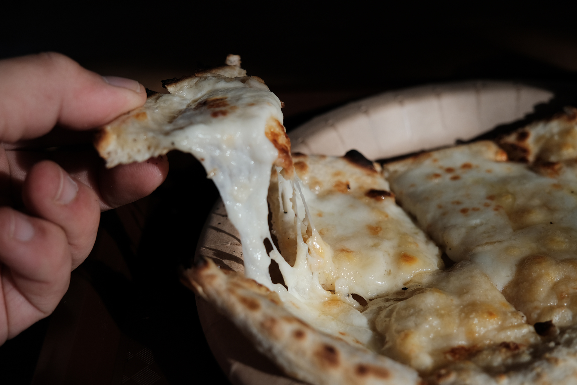 あさぎり高原青空キッチンで、朝霧乳業の搾りたての牛乳と、モッツアレラチーズを使った焼きたてピザをいただく。見よ、この伸びっぷり!美味すぎ!