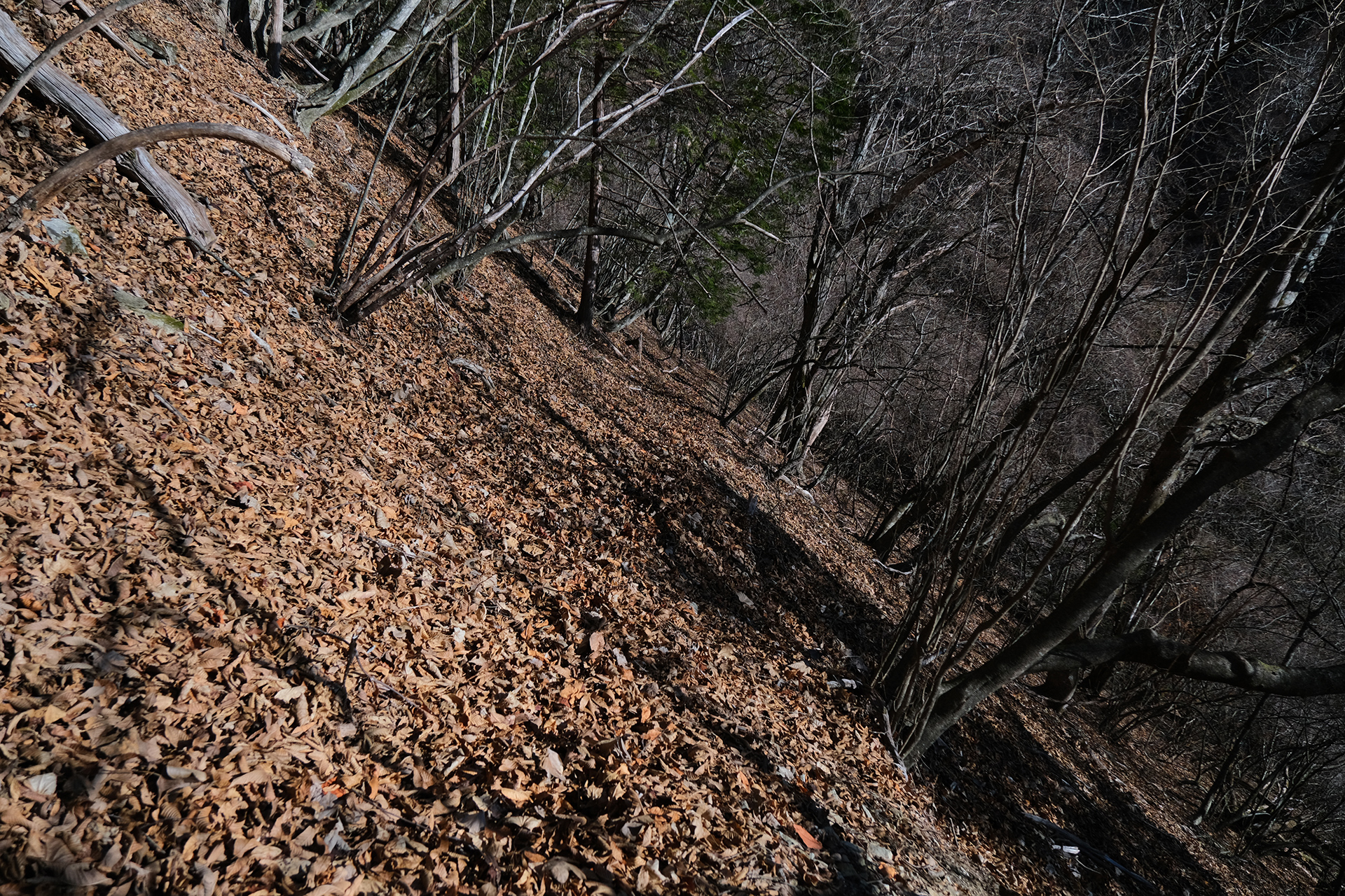一部南側の斜面をトラバースするルートは道幅が狭く、踏み跡も薄い。落ち葉もたっぷりあり、滑らないように慎重に進む。振り返っての1枚。