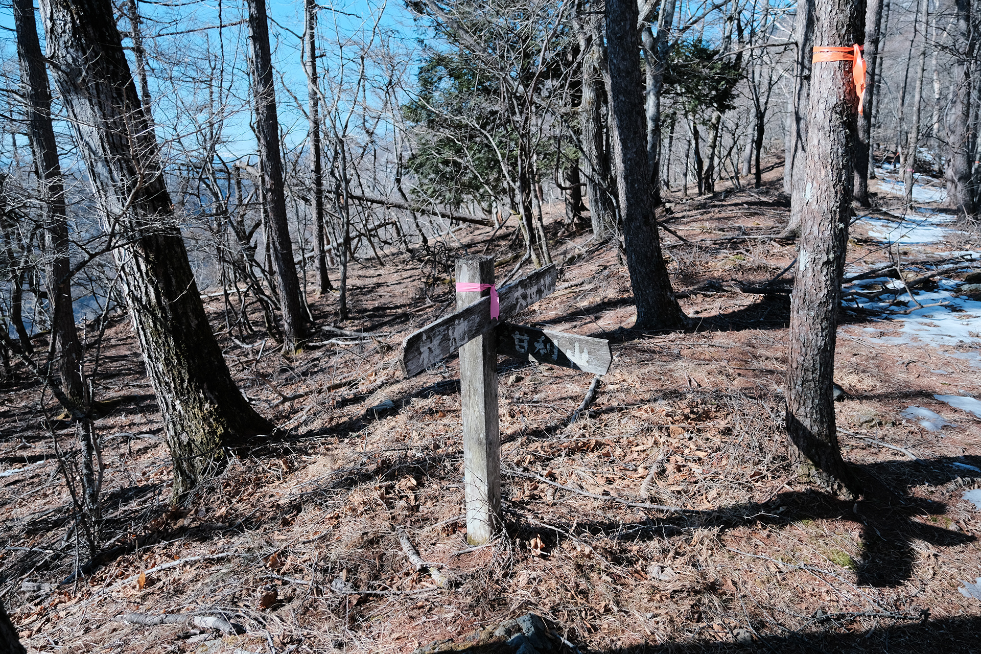 南甘利山と甘利山への分岐に到着。といっても、南甘利山(直進)へはここからほぼ平坦な100mほどしかないのだけど。ここまで斜面トラバース地点以外は特に危険箇所もなく、ルート明瞭でよく整備されている。