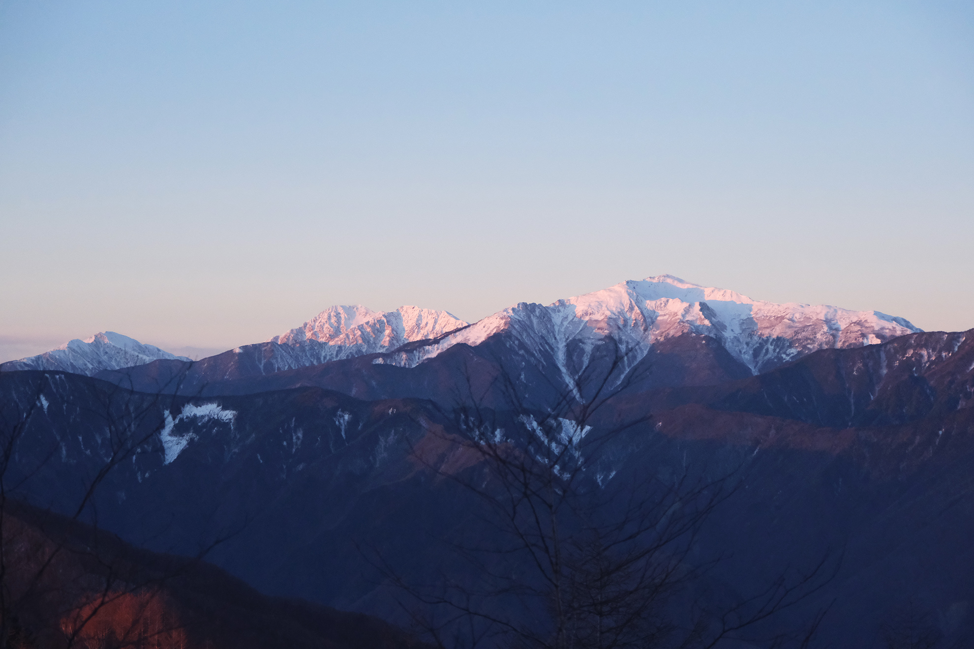 角度的にモルゲンロートにはならないけれど、安倍奥の山々、山伏、青笹山、笊ヶ岳も、葉が落ちた木々の間から見える。